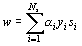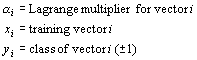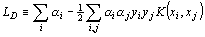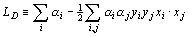The training of a classification SVM involves the fitting of a hyperplane such that the largest margin is formed between 2 classes of vectors while minimising the effects of classification errors (figure 1). This is solved by formulating it as a convex quadratic programming problem. Without going into the details, this gives the Lagrangian: